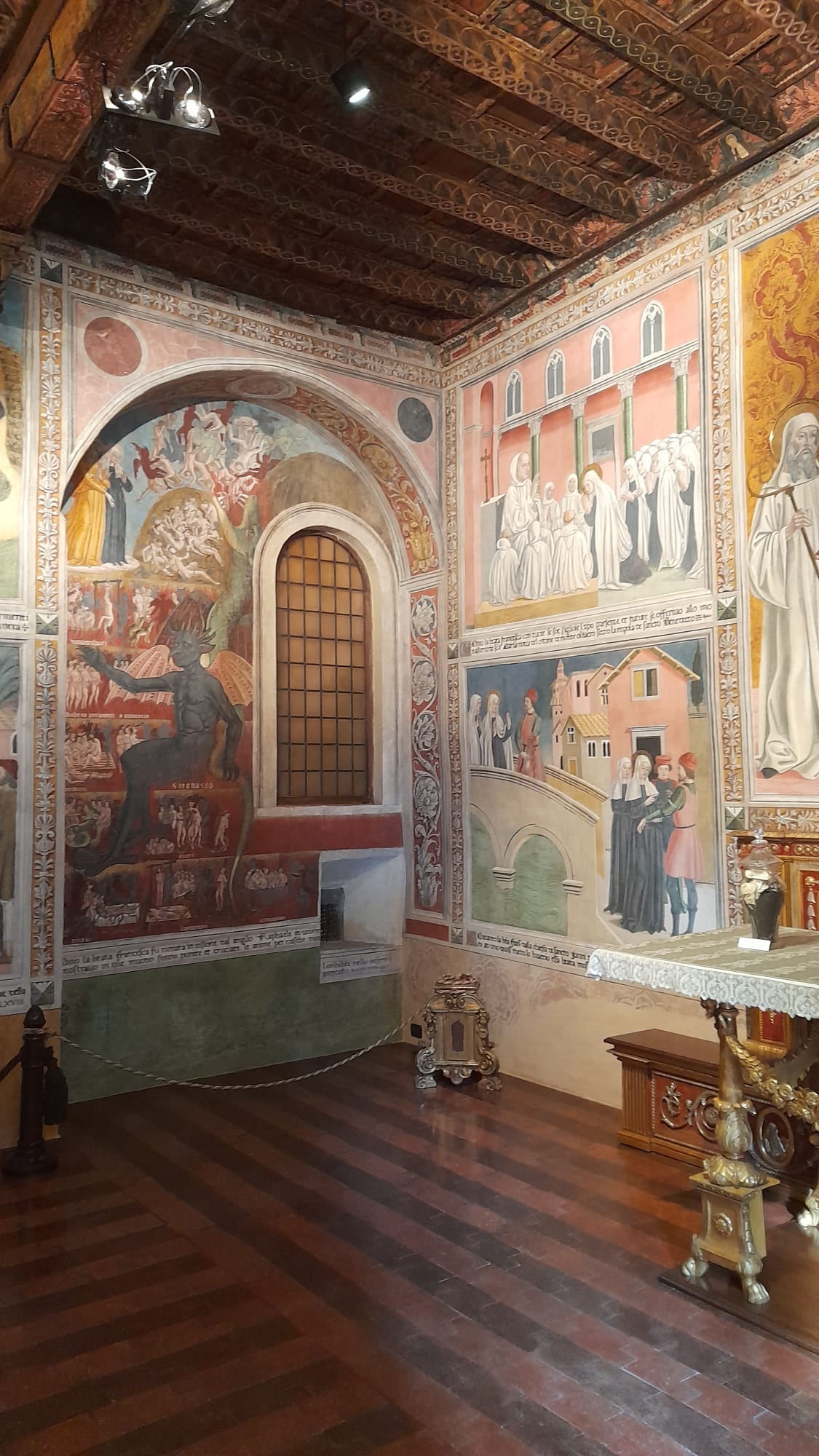 Altre storie sono dipinte nel refettorio, che conserva anche pareti affrescate con immagini della Roma seicentesca: da qui si accede alla cella dove la Santa trascorse gli ultimi anni della sua vita e dove, all’interno di una vetrinetta, sono conservati alcuni suoi vestiti.